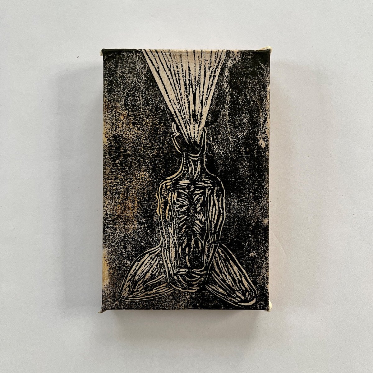 Cassette comes in a folded cardboard cover in three different colours (25 copies on brown cardboard, 20 copies on black cardboard and rest on brown/white cardboard). Front cover is made by artist, using traditional Japanese woodblock printing with sumi on self-rusted Japanese paper. Every tape is unique and comes with A4 lyric insert and stapled wood block printed tracklist. Chrome tape limited to 100 copies.
